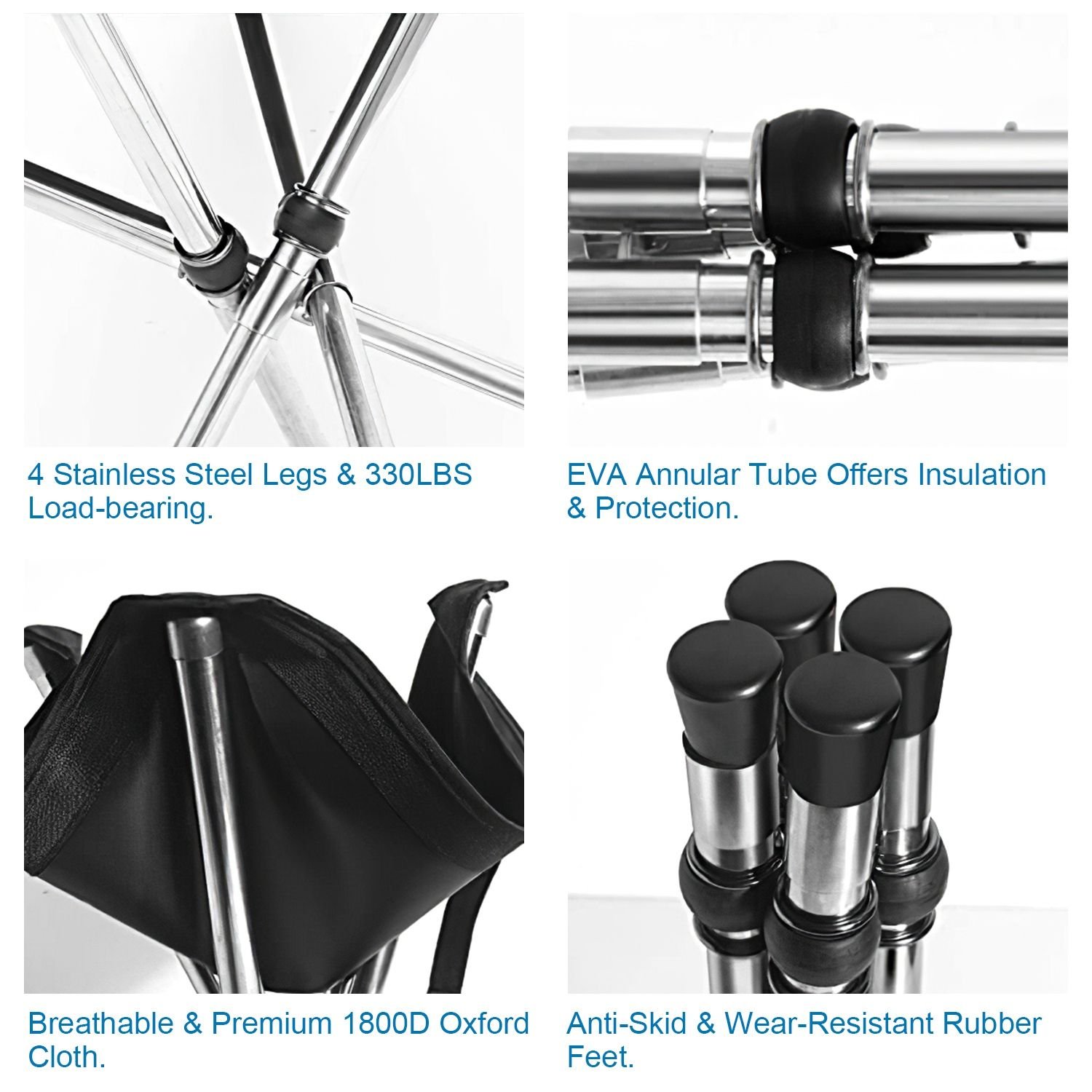 *330LBS Load*:Four-legged design can provide better support. Made of great rubber feet covers and thicker chair surface,offers our camping stool outstanding skid resistance and up to 330lbs load-bearing capacity.