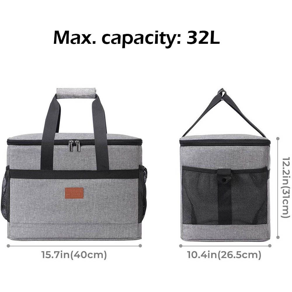 MEASUREMENTS : The Cool Bag's maximum capacity is 32L The overall dimensions of the lunch bag are 15.9*10.4*12.2 inch / 40.5*26.5*31 cm.